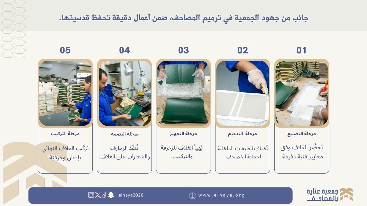 نبذة عنا شرف الله العرب بأن اختار منهم نبيه محمدا صلى الله عليه وسلم - ليكون خاتم الأنبياءِ ، ثم شرف جزيرة العرب بأن أنزل كتابه المبين وهدايته للعالمين على ثراها ، ومن هنا تشرفت المملكة العربية السعودية بأن تحملت أمانة رعاية كتاب الله وحفظه، وشرف خدمته وطباعته ونشره ، وانشاءت صرح مجمّع الملك فهد لطباعة المصحف الشريف)، الذي يُعدّ أعظم صروح . حفظ القرآن، وخدمته، ونشره، في تاريخ الإسلام. وكان من ثمار هذا التكليف والتشريف أن تداعَى أهل الخير والقرآن في أحساءِ العلم والعلماء إلي باب من أبواب التشرّف بخدمة القرآن والعناية بالمصاحف المستهلكة؛ حيثُ تتداولها آلاف الأيدي على مدار الأعوام؛ لتنال أجر التلاوةِ والحَفْظِ ؛ مما يحتاج إلى صيانتها وتجديدها، وإعادة توزيعها . فكانَ أنْ نَشأَ (مركز معالي الدكتور محمد بن حسن الجبر للعناية بالمصاحف بالأحساء). الذي أسسه فضيلة الشيخ خالد بن محمد المغربي -رحمه الله- في شهر رمضان عام ١٤٢٧ للهجرة، تحت مظلة جمعية تحفيظ القرآن بالأحساء (خير)، وبتأييد وشكر لتأسيسها من مقام مُحافظة الأحساء.